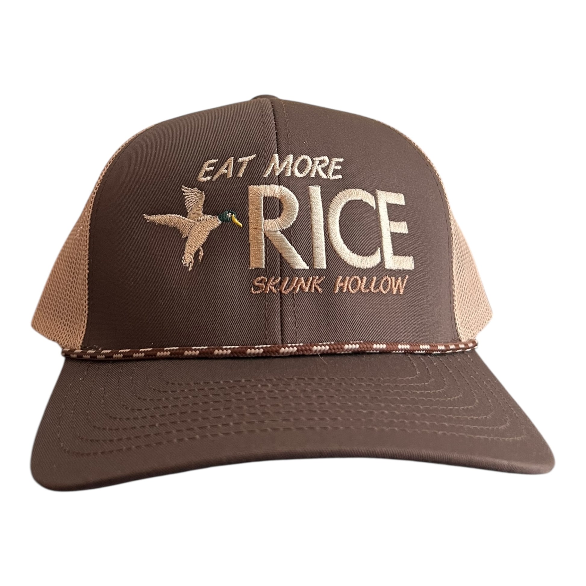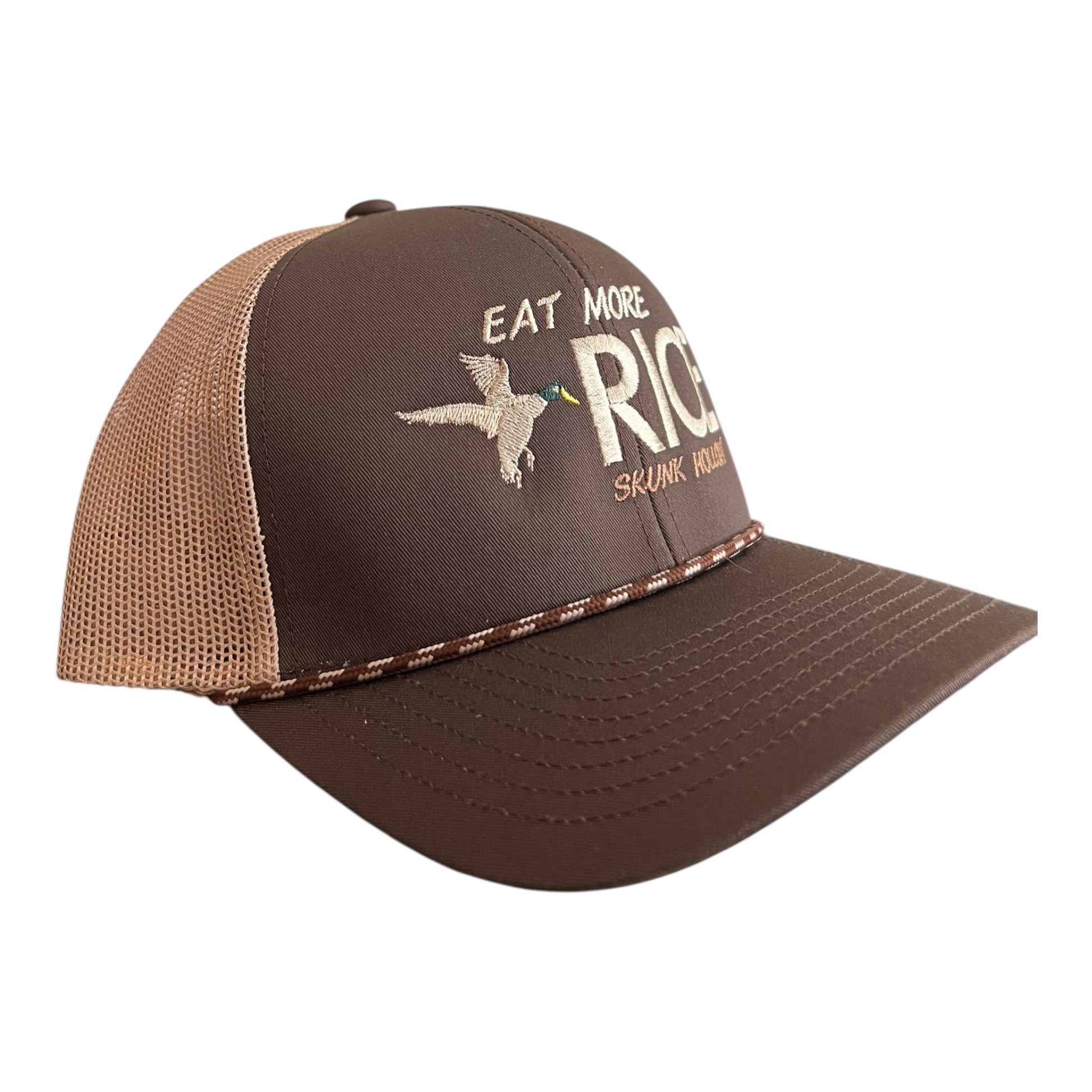 This hat says EAT MORE RICE, but it means a lot more than that to us. Rice is what my area of the state was built on and waterfowl habitat conservation goes hand in hand with rice. The more rice you eat, the more rice we plant. Every time one of these hats get sold, a portion of the proceeds goes directly to a waterfowl habitat conservation fund. We wear this hat with pride.