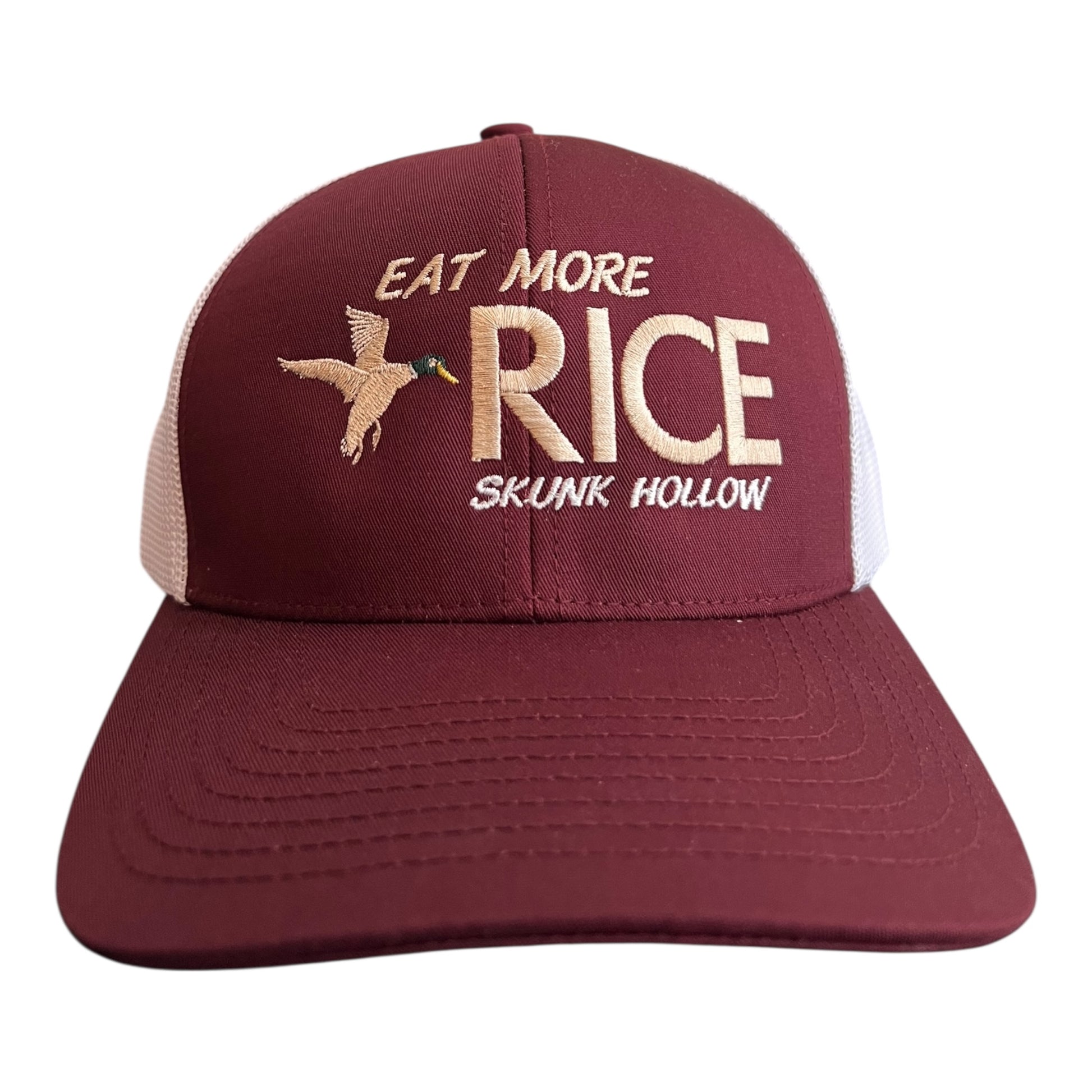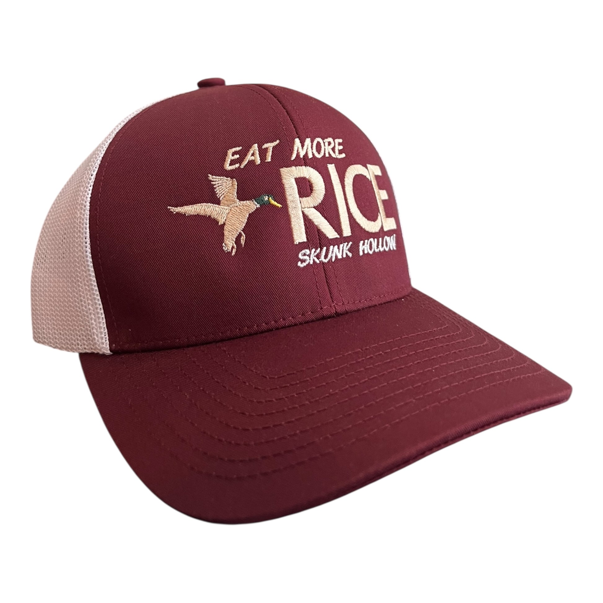 This hat says EAT MORE RICE, but it means a lot more than that to us. Rice is what my area of the state was built on and waterfowl habitat conservation goes hand in hand with rice. The more rice you eat, the more rice we plant. Every time one of these hats get sold, a portion of the proceeds goes directly to a waterfowl habitat conservation fund. We wear this hat with pride.