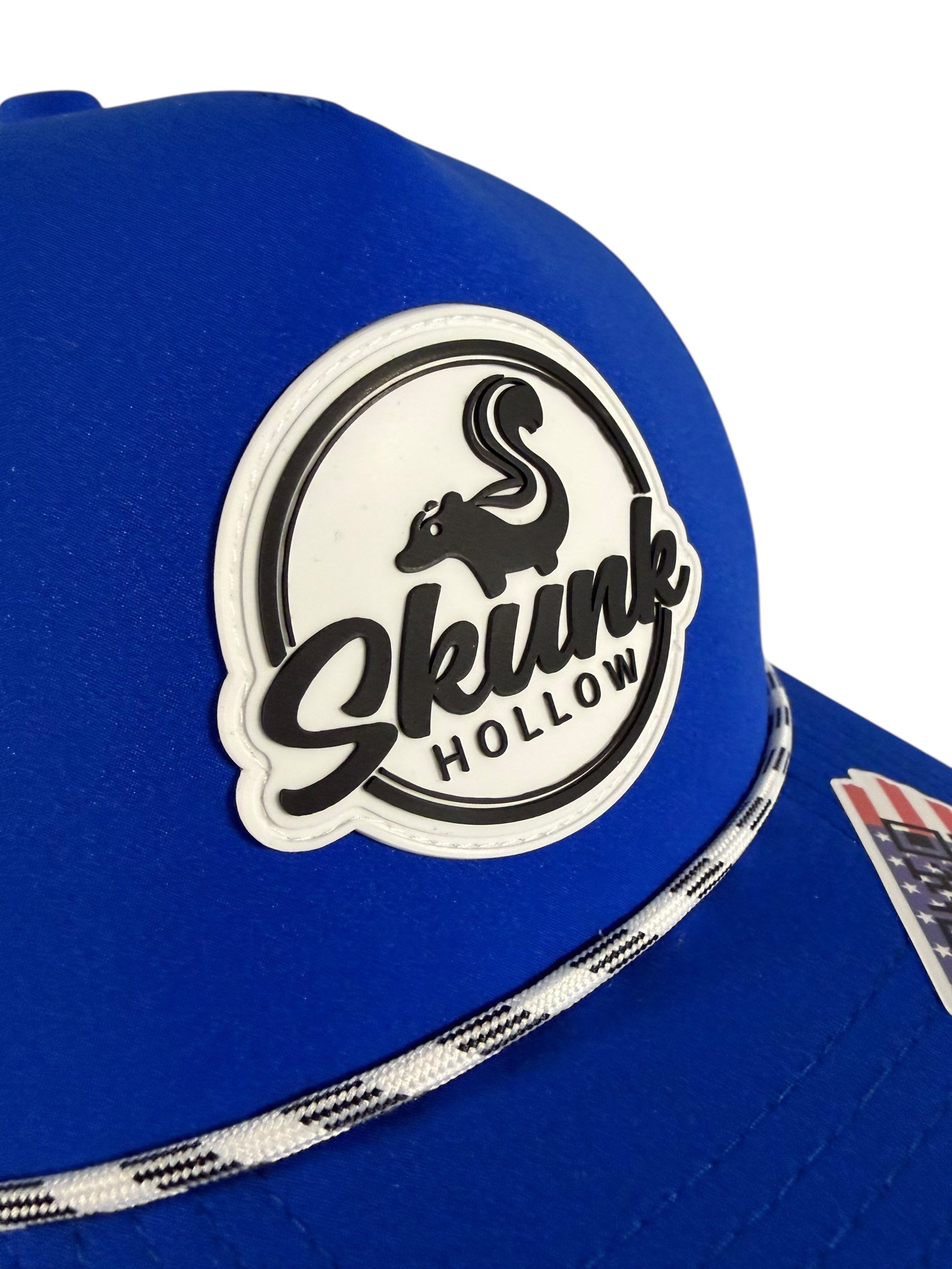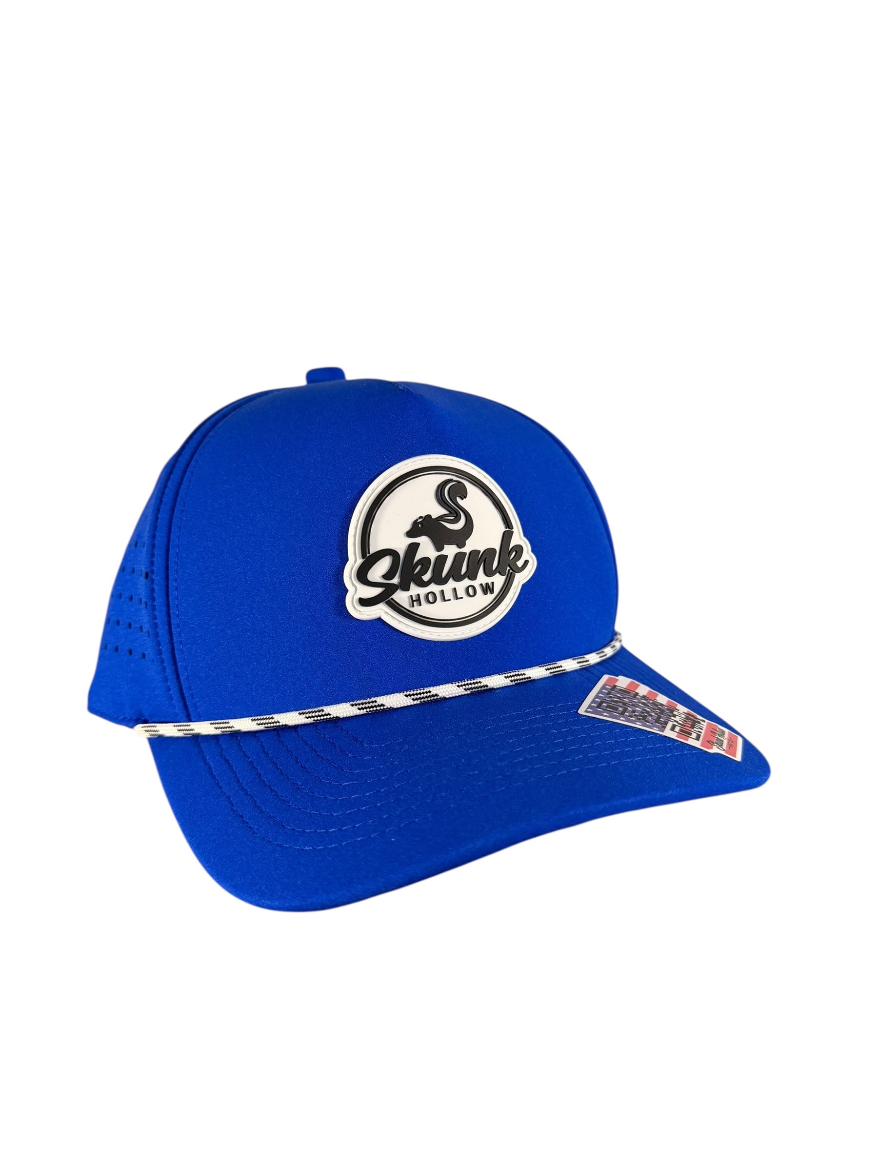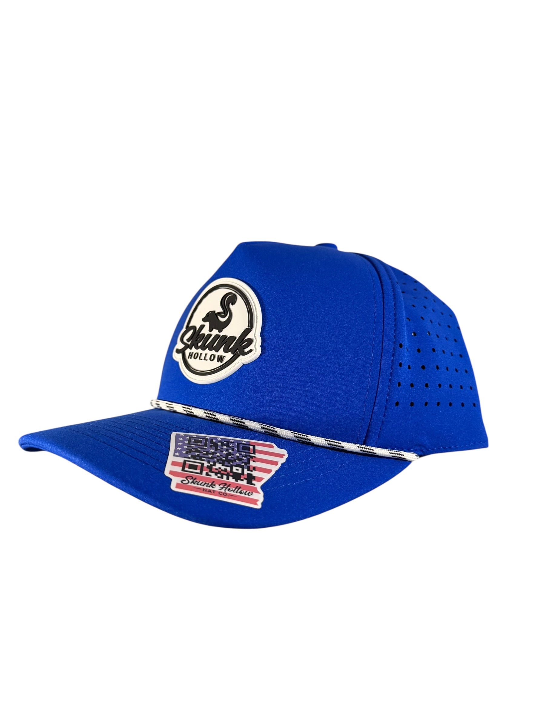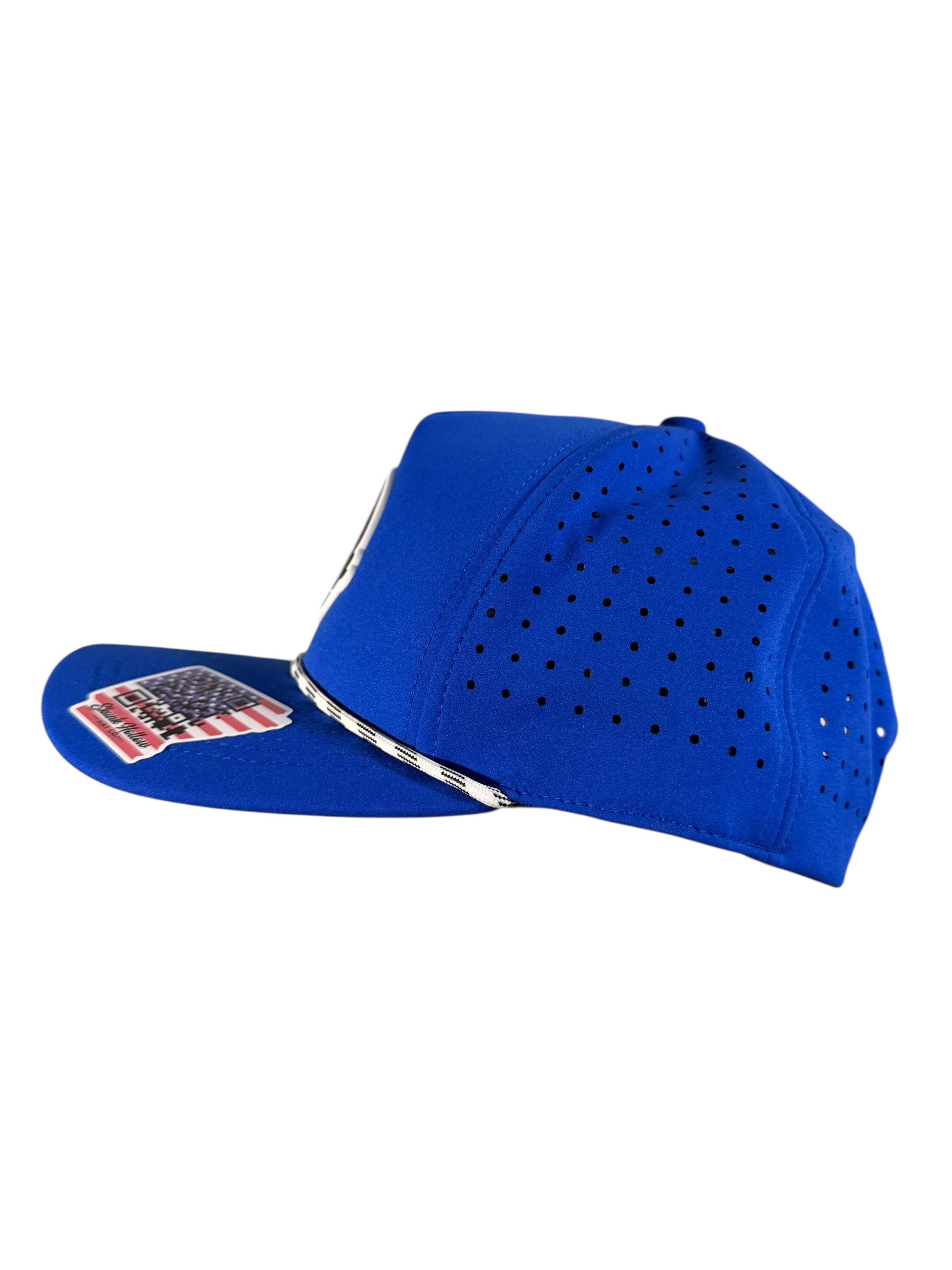 Moisture wicking, laser hole perforated, breathable, snapback, weatherproof sewn-in PVC patch, and water-resistant nylon blend.