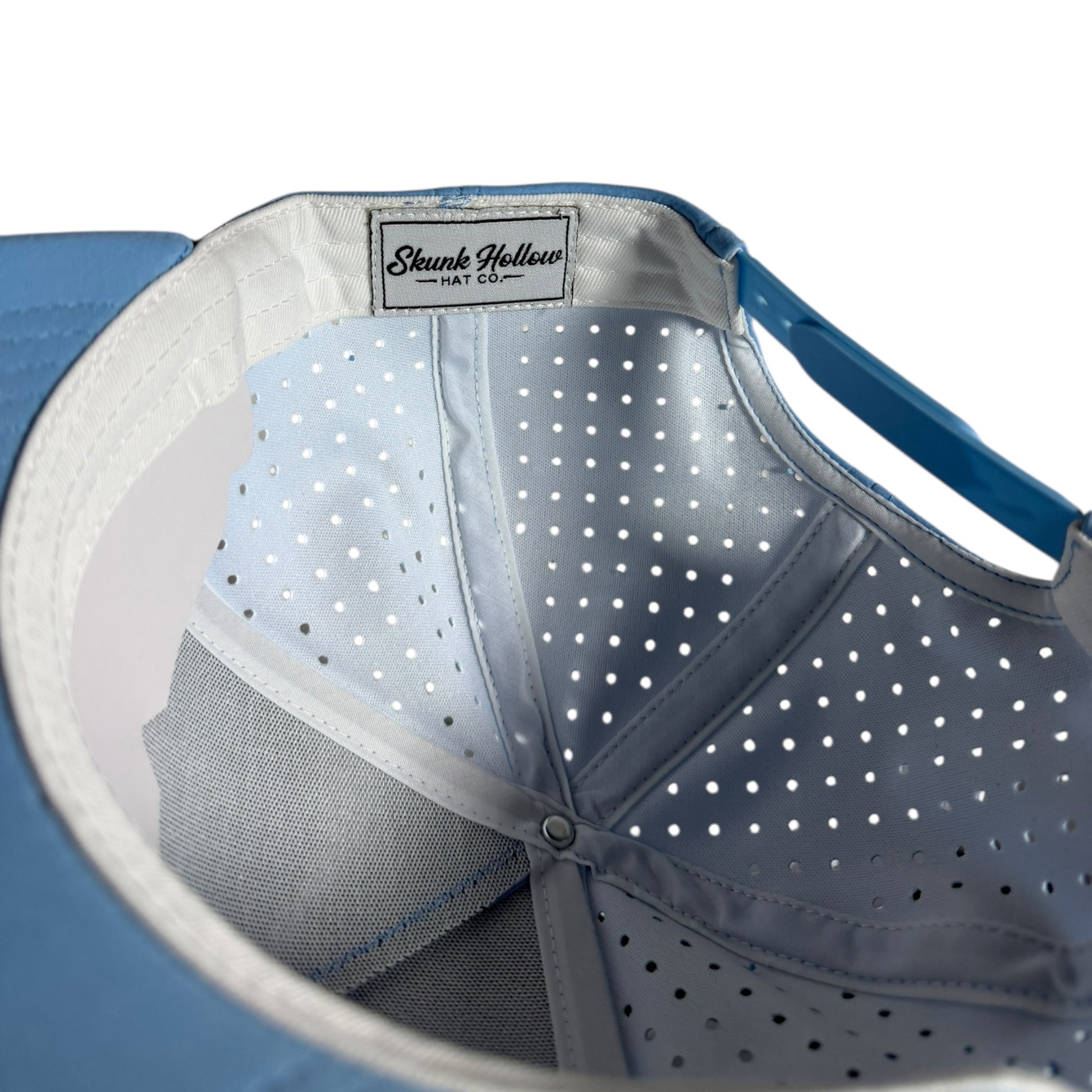 Moisture wicking, laser hole perforated, breathable, snapback, and water-resistant nylon blend.