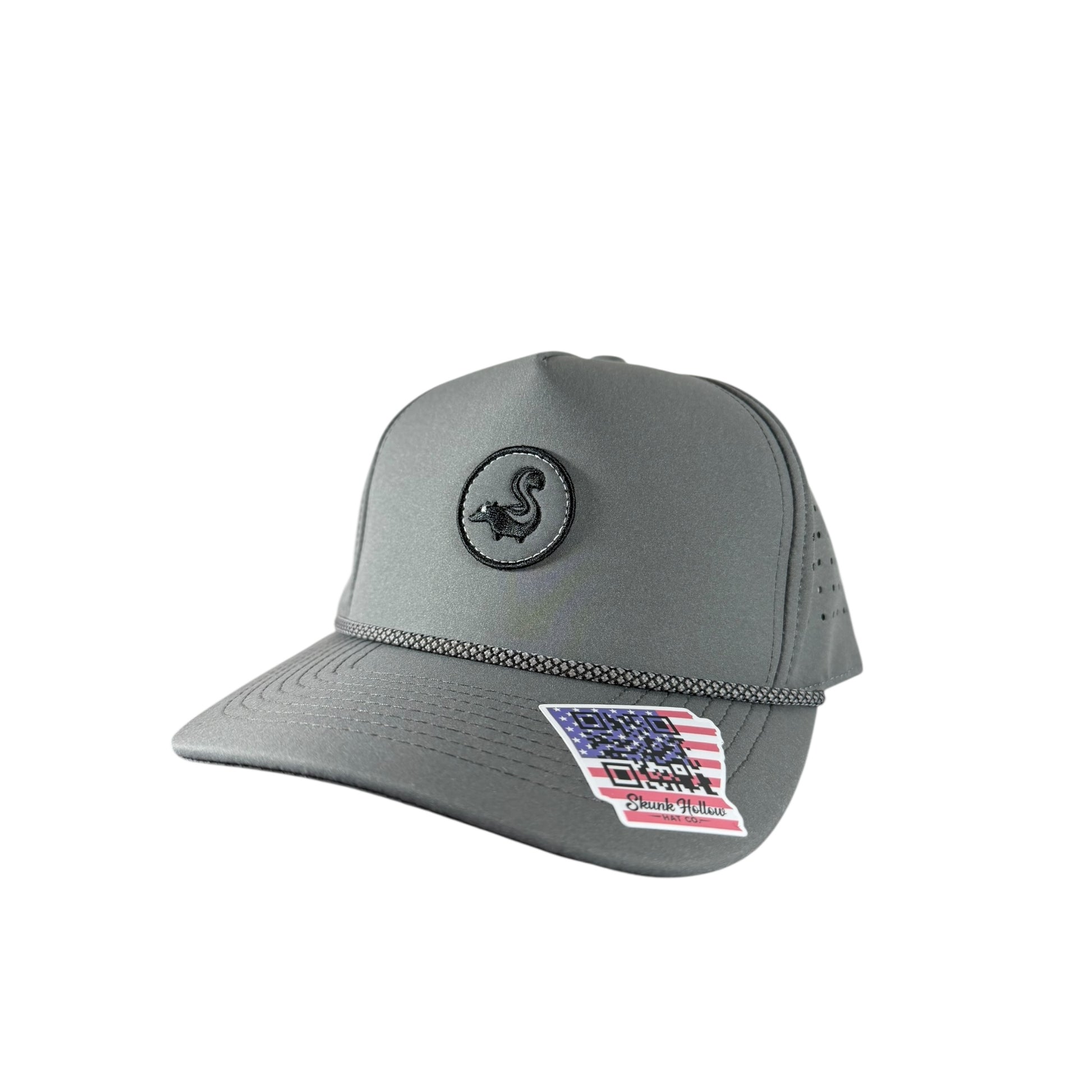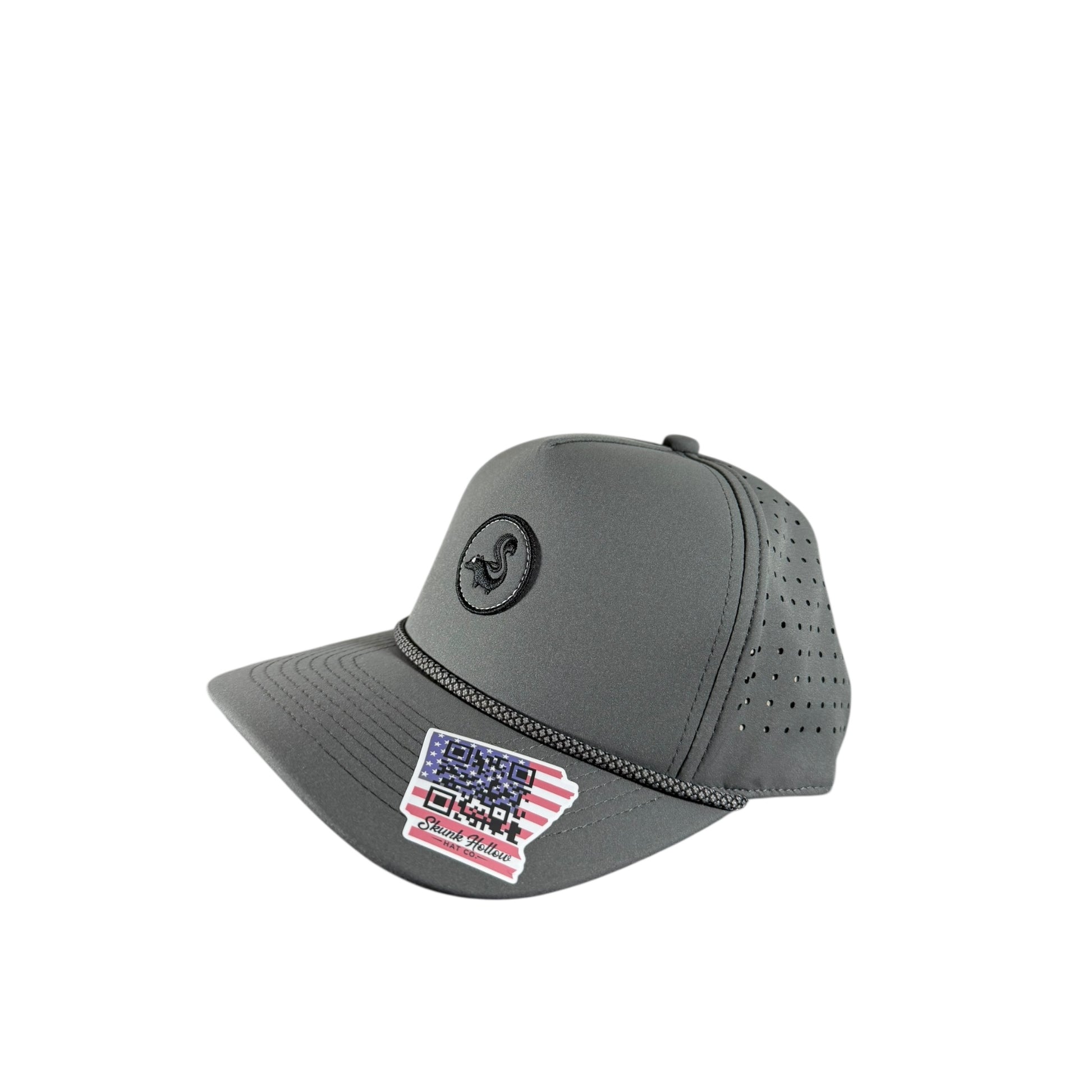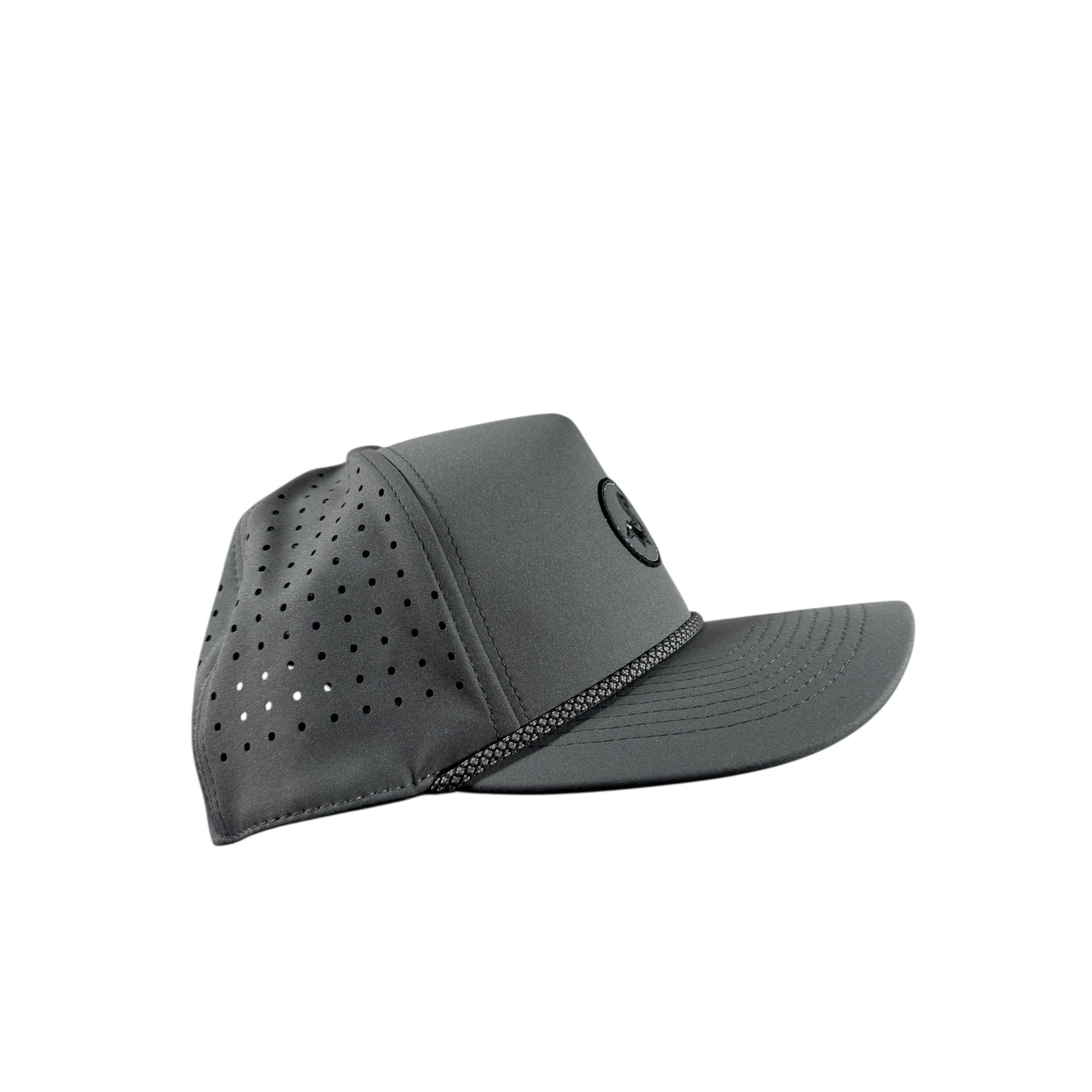 Moisture wicking, laser hole perforated, breathable, snapback, and water-resistant nylon blend.