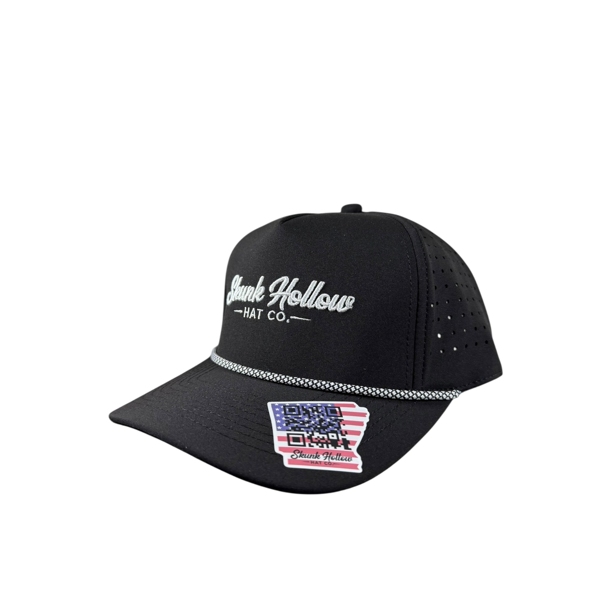 Moisture wicking, laser hole perforated, breathable, snapback, and water-resistant nylon blend.