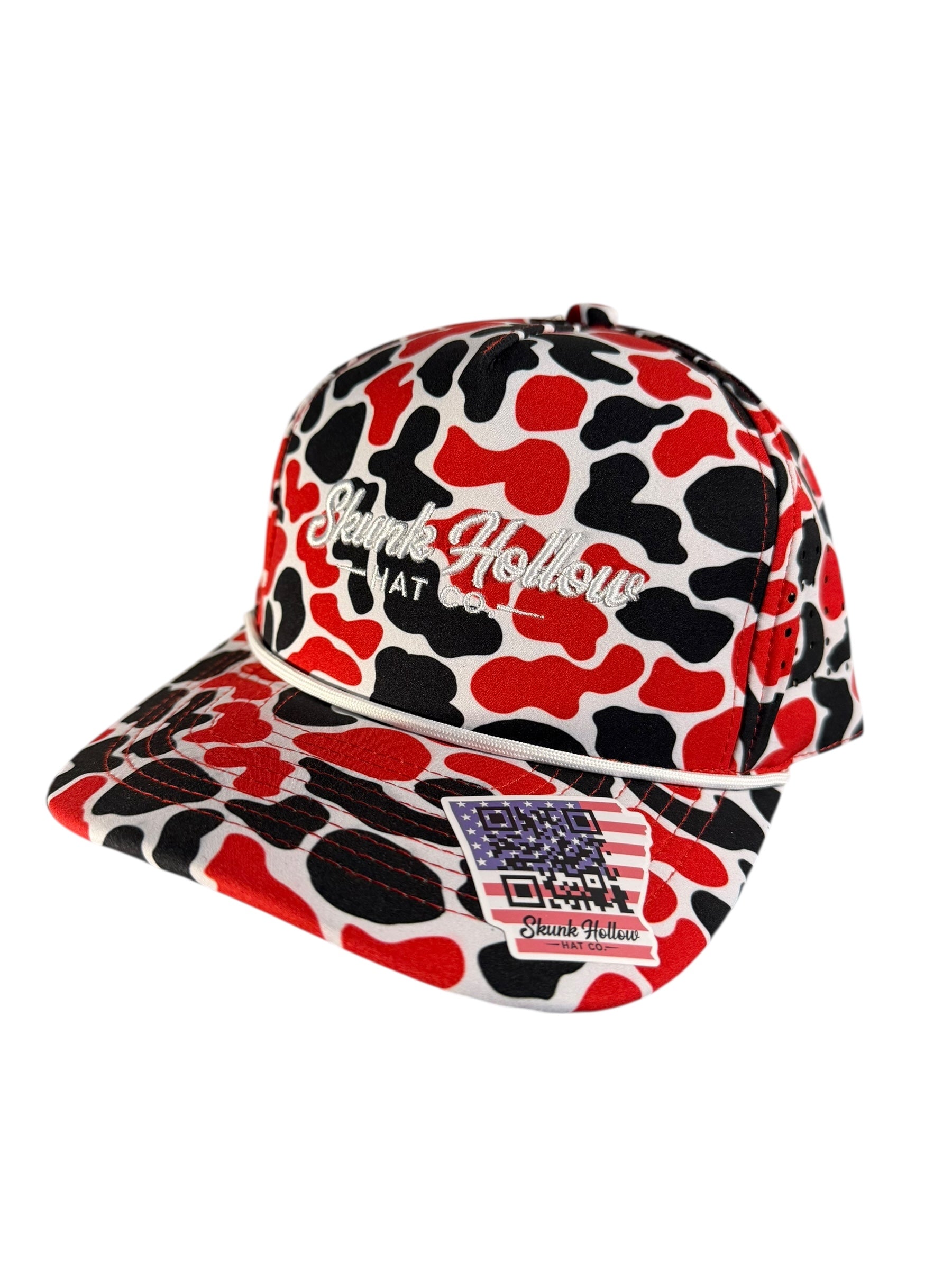 Moisture wicking, laser hole perforated, breathable, snapback, and water-resistant nylon blend.